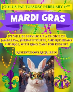 Join us for this very special Fat Tuesday dinner on Tuesday, February 17th! RESERVATIONS REQUIRED!